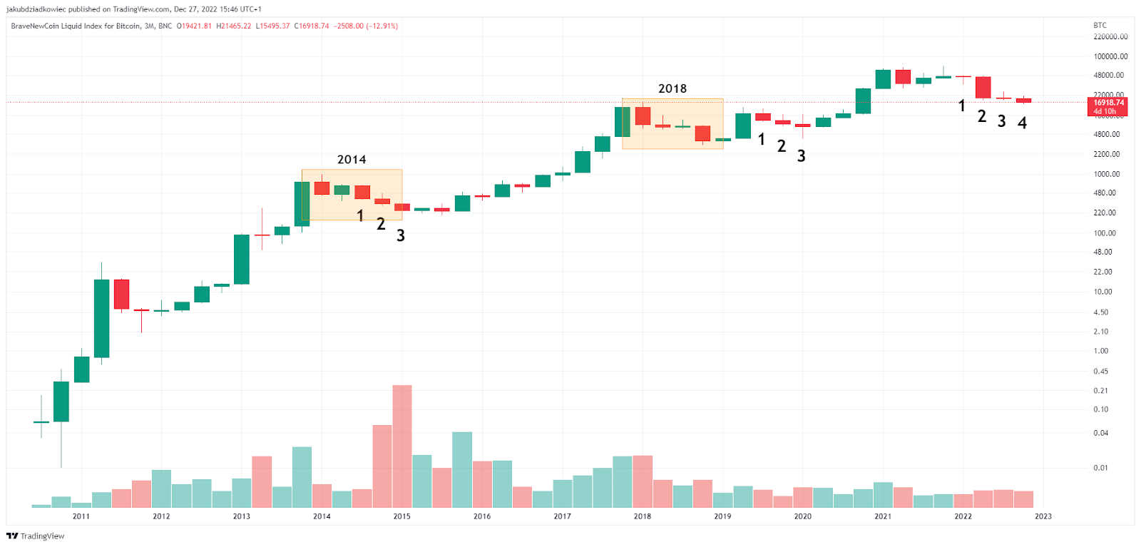 The above table confirms our conclusions from the previous section about two years with 3 bearish quarterly candles: 2014 and 2018. If 2022 closes below the $19,422 level, it will be an unprecedented 4 red quarters in a row. Moreover, they will be generated within the same calendar year.