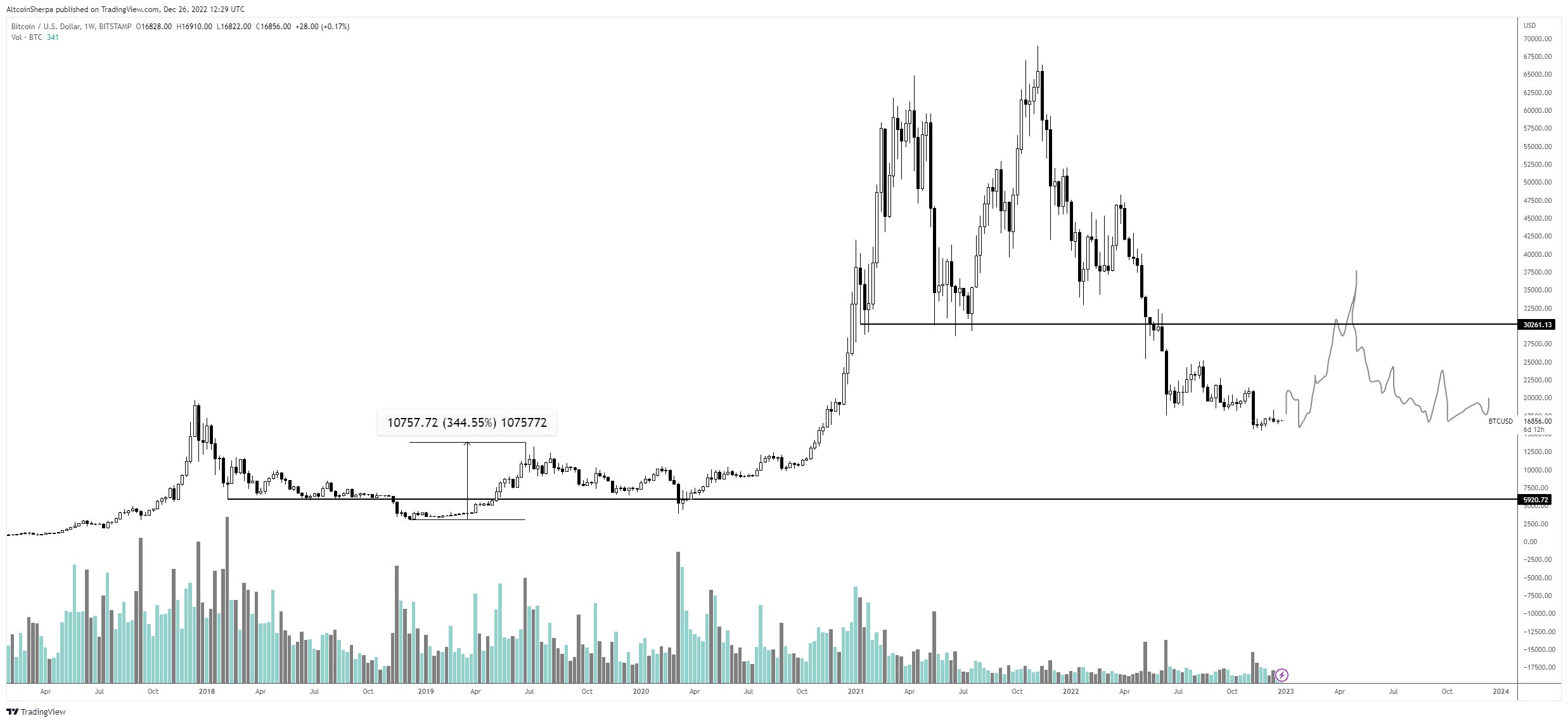 Looking at Altcoin Sherpa’s chart, the analyst appears to predict that Bitcoin could surge to around $38,000, suggesting an upside potential of nearly 130% for the largest crypto asset by market cap.