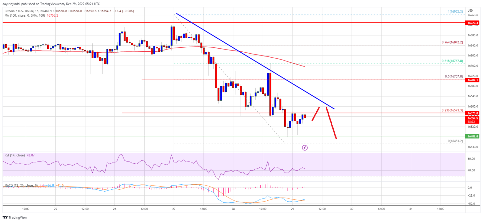 Bitcoin price is now facing resistance near the $16,580 level. It is close to the 23.6% Fib retracement level of the downward move from the $16,961 swing high to $16,453 low. There is also a key bearish trend lie forming with resistance near $16,600 on the hourly chart of the BTC/USD pair.