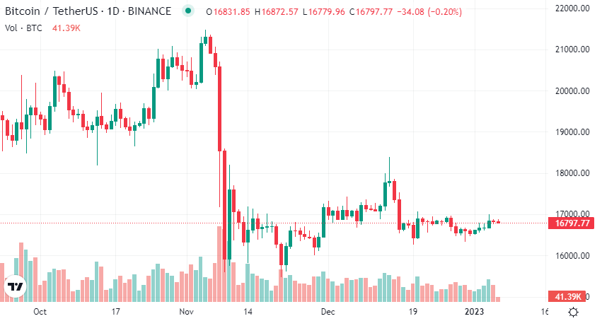 According to CoinMarketCap, BTC is currently trading hands at $16,798.04 after a 0.15% drop in price over the last 24 hours. The crypto king was able to reach a high of $16,878.76 and a low of $16,790.28 over the same time period.