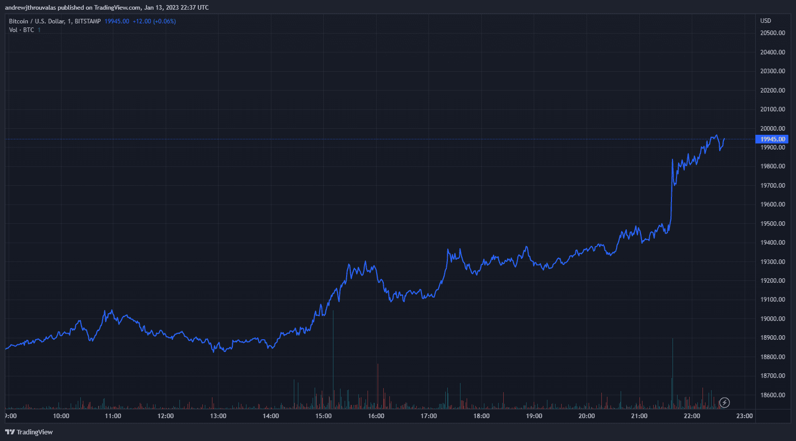 - As of 22:28 UTC, Bitcoin traded at $19,962, up from roughly $18,800 at the start of the day.