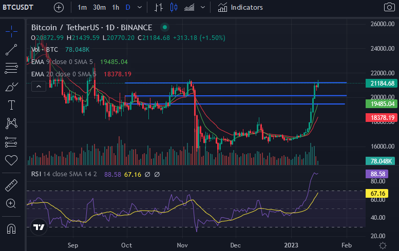 BTC’s price is trading at a daily resistance level at $21,132.28 after flipping the resistance level at $20,170.04 into support just two days ago. Technical indicators on Bitcoin’s chart suggest that there is enough bullish support to overcome the current resistance level.