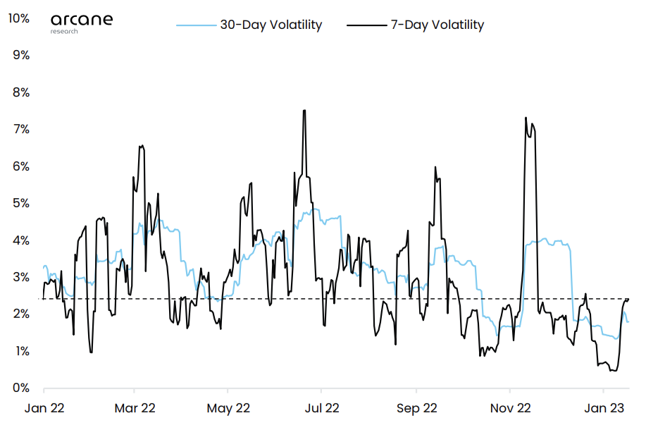 Increased trading typically correlates to an increase in volatility. While the current 2.4% 7-day volatility levels are still below the 2022 7-day average of 3.1%, Bitcoin has remained consistent during the 2023 rally.