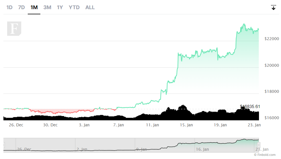 At press time, Bitcoin is changing hands at the price of $22,887, which represents an increase of 0.55% on the day, 9.71% across the previous week, and as much as 35.89% over the past 30 days, as its charts demonstrate.