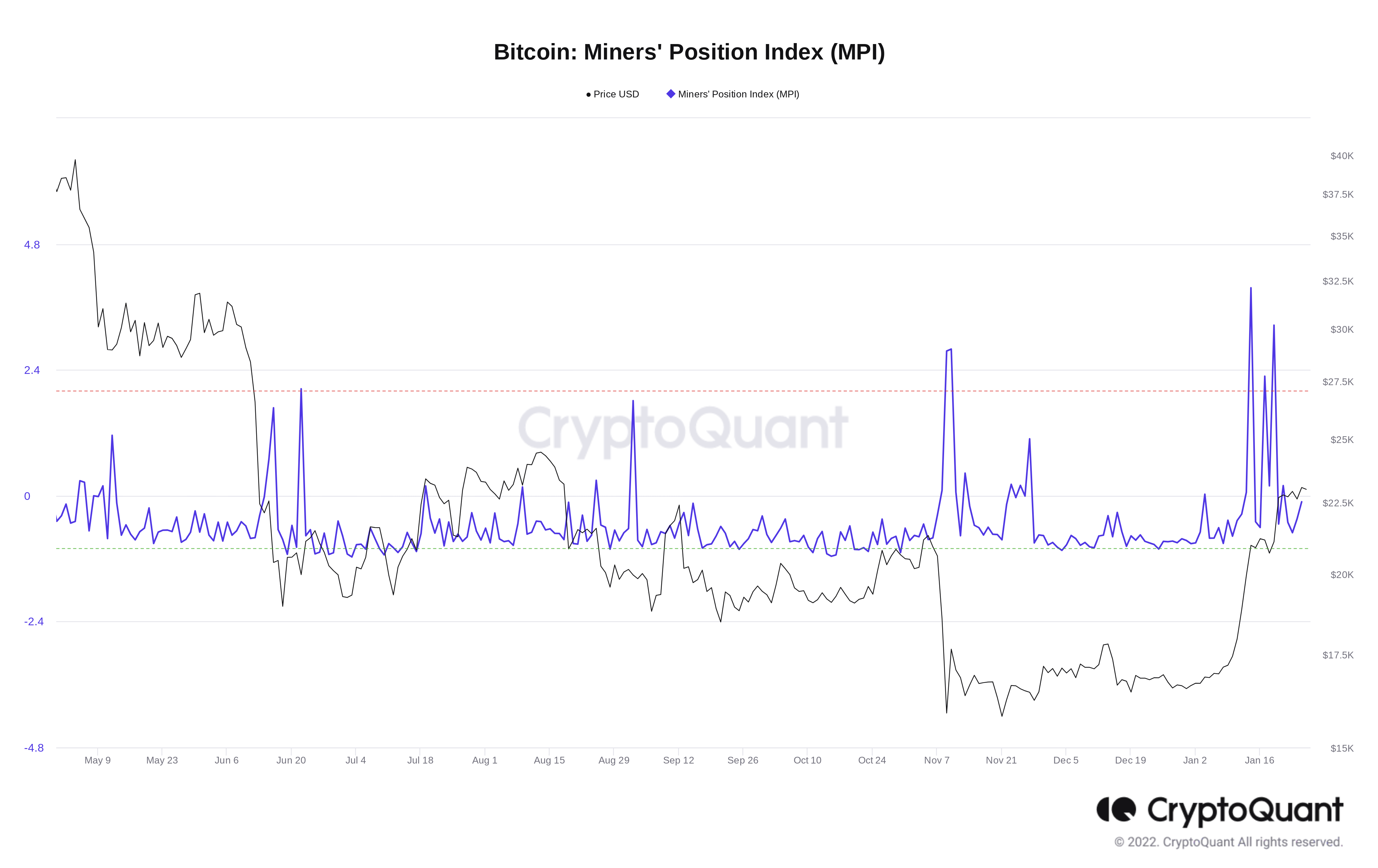 CryptoQuant’s miner position index, which measures BTC outflows to exchanges from miner wallets relative to their one-year moving average, has captured several spikes in withdrawals since Jan. 14.