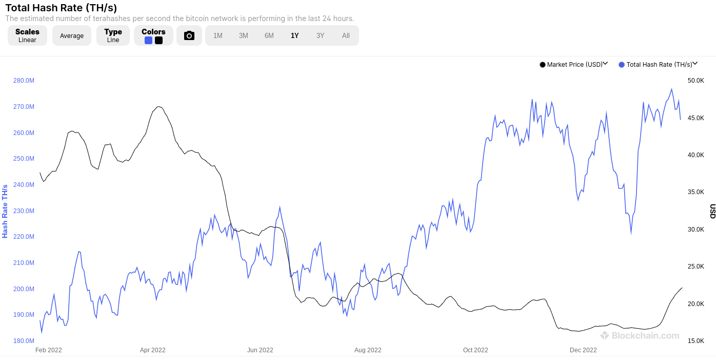 Other trackers from BTC.com and Blockchain have slightly lower estimates, both being around 275 EH/s on the day. The latter shows hash rate hitting an all-time high of 276.8 EH/s on Jan. 20.