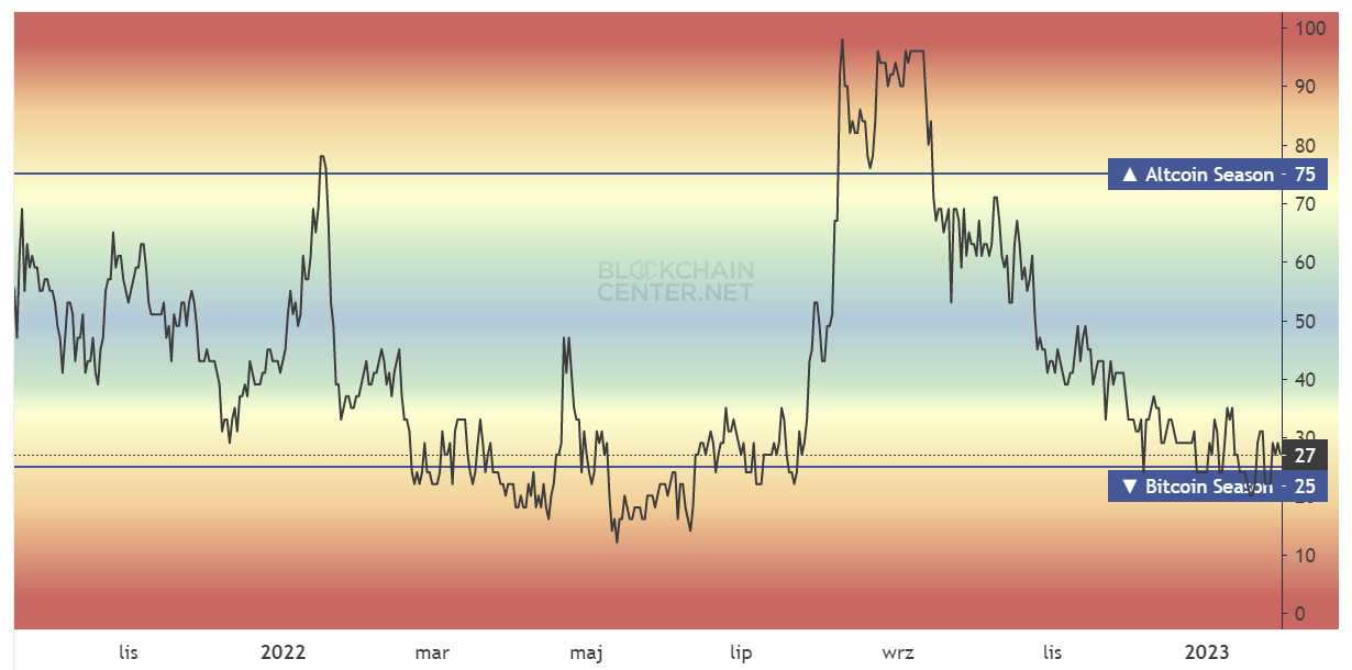 The indicator performance over the past two months oscillates in the 25-35 area, while today Altcoin Season Index points to 27. This means that however, altcoins are trying to keep pace with Bitcoin, and the market is clearly leaning towards the dominance of the orange cryptocurrency.