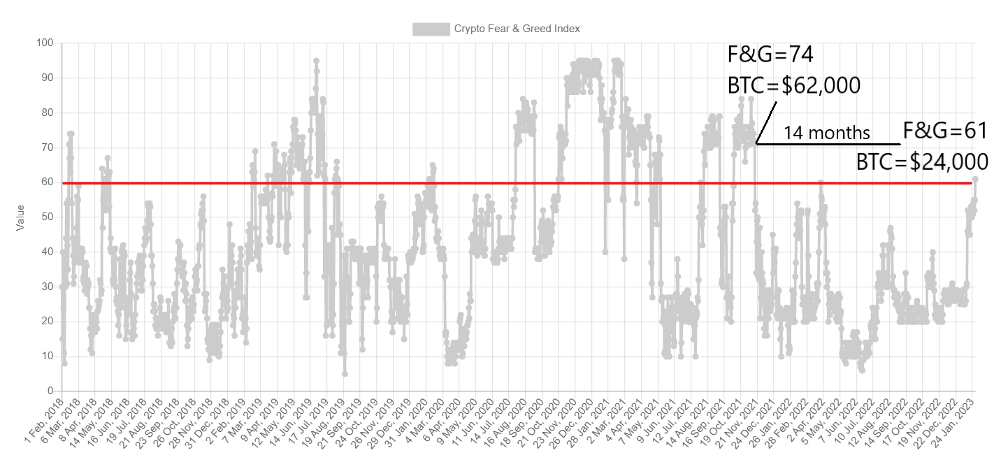 The rapid rise in Bitcoin price in January 2023 led the Fear and Greed Index to a high level of “greed.” Today’s index reading of 61 is a value not seen in the cryptocurrency market for more than a year: