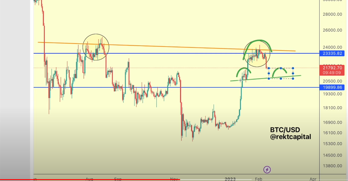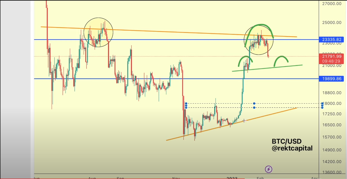 Pseudonymous analyst Rekt tells his 45,500 YouTube subscribers that over the past two weeks, Bitcoin has confirmed downside continuation after it failed to take out resistance at around $24,000.