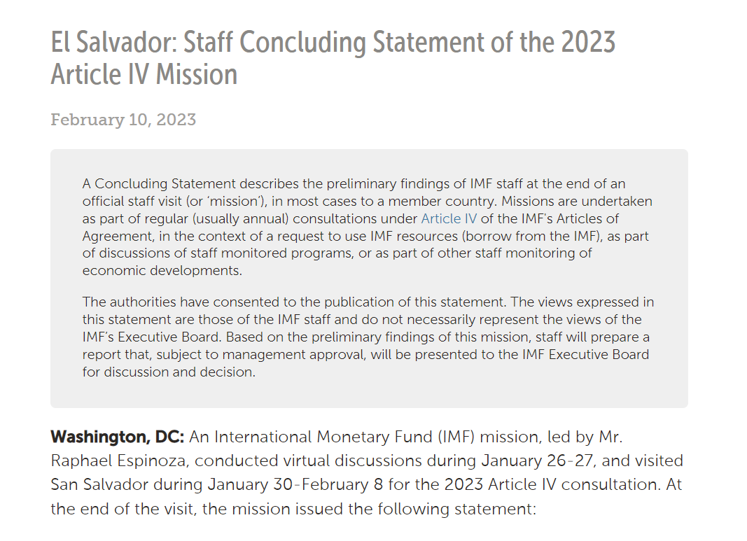El Salvador paid $600 million in bonds last month, which preceded the IMF’s “article IV” visit to the nation between January 30 and February 8.