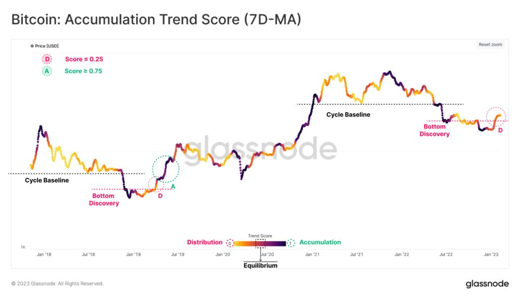 However, investors still have less interest in accumulating BTC amid the bottom price range, as Glassnode hinted at a decline in the accumulation score. The trend score is now at 0.25, which signifies a distributive nature in the market as sellers are exiting their positions to get the maximum profit in the dip.
