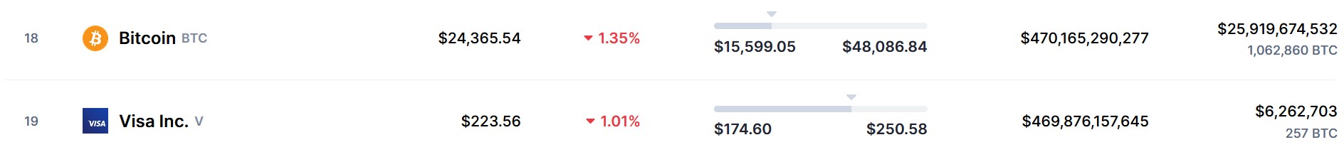 With the BTC price currently at $24,365, its market cap of $470.16 billion is now marginally above that of Visa with a market cap of $469.87 billion, according to CoinMarketCap.