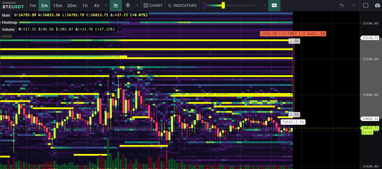 “2500 BTC in sell orders stacked between $24.8-25.3K on the BTC/USDT pair,” popular trader Daan Crypto Trades continued.
