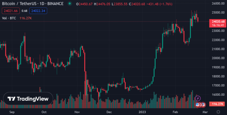 CoinMarketCap indicates that BTC is trading hands at $24,040.47 after a 3.77% decrease in price over the last 24 hours. BTC also reached a high of $25,126.85 and a low of $23,959.81 over the same time period. The crypto is, however, still in the green by more than 8% over the last week.