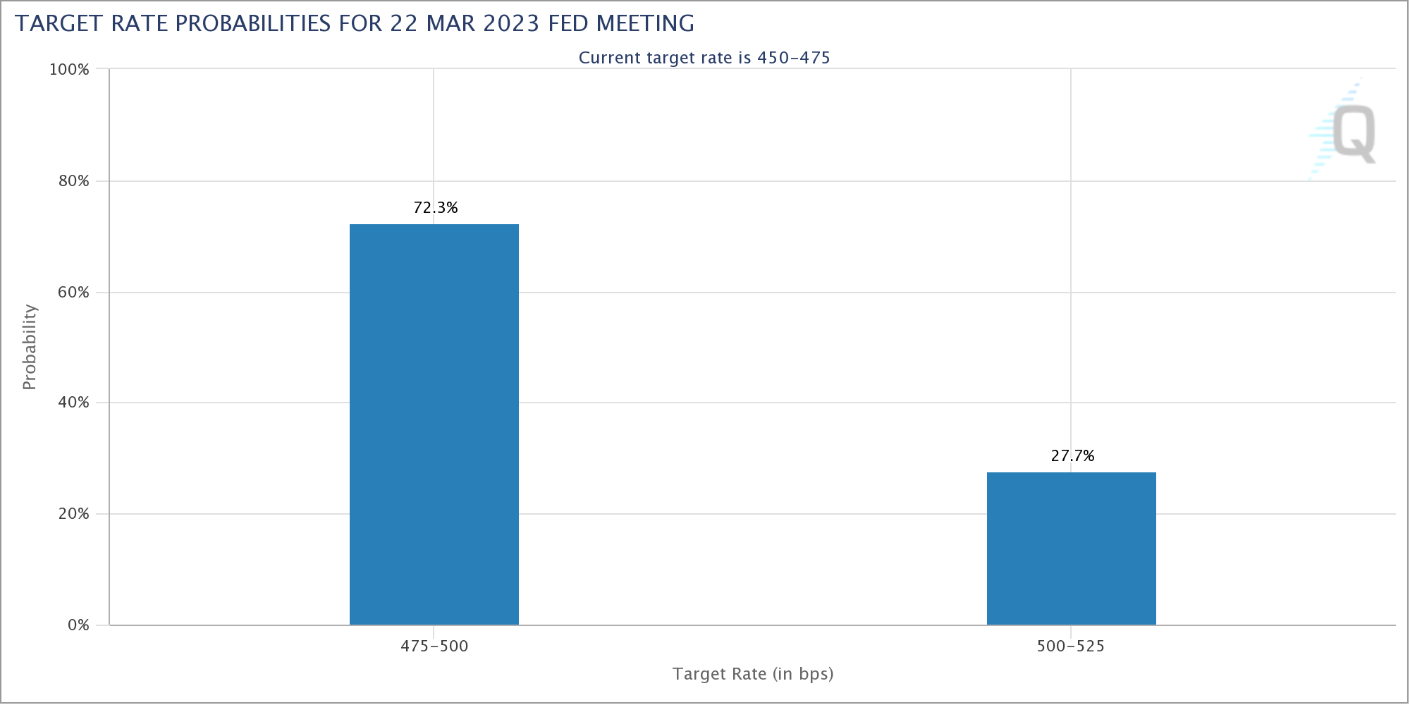 According to CME Group’s FedWatch Tool, the odds of a 0.5% hike instead of the 0.25% seen in February currently stand at 27.7%.