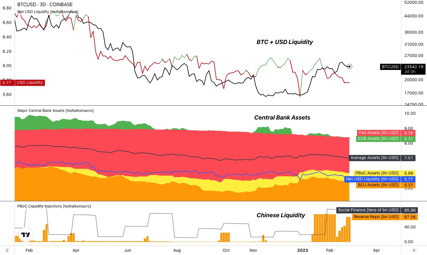 “Global liquidity - projected to rise in 2023, but recently has pulled back,” popular commentator Tedtalksmacro tweeted on the day.