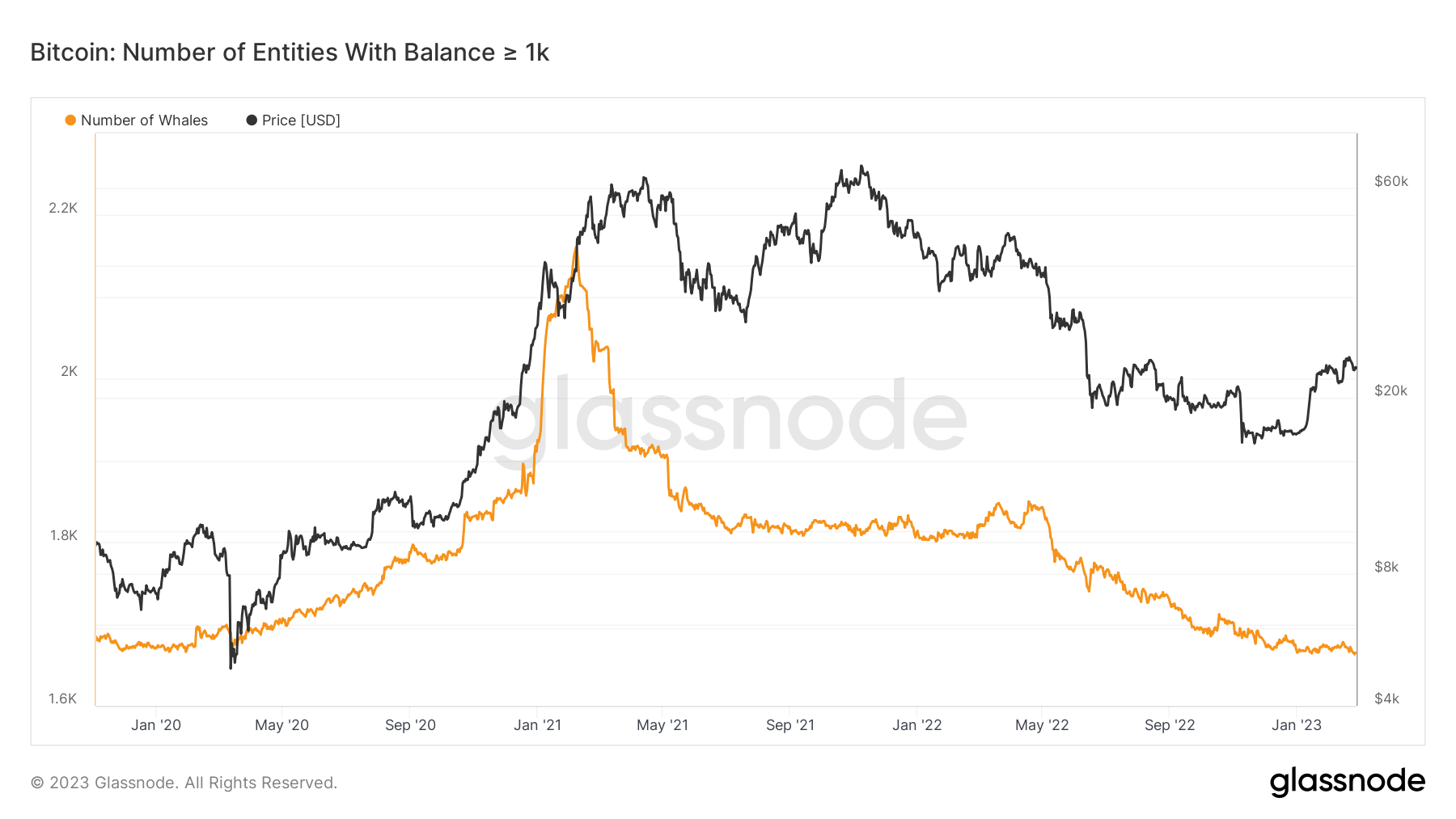 According to Glassnode, whale numbers are now at their lowest in three years — just 1,663 unique entities now control 1,000 BTC or more. Three years ago, in February 2020, Bitcoin traded at under $10,000.