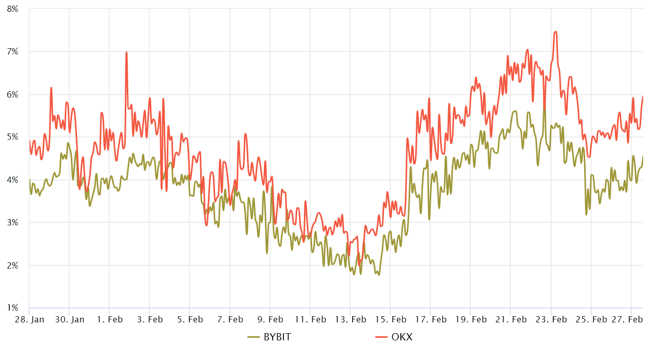 After peaking at 4% in late January, the USDC premium indicator in Asian markets has declined to a neutral 2%. The metric has since stabilized at a modest 2.5% premium, which should be interpreted as positive considering the recent regulatory FUD.