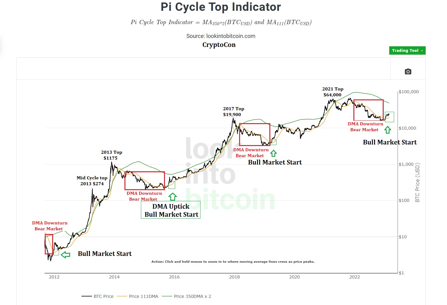 According to a Twitter post by CryptoCon, a technical analyst and long-term data researcher, the Pi Cycle top/bottom indicator has signaled the beginning of a new bull market.