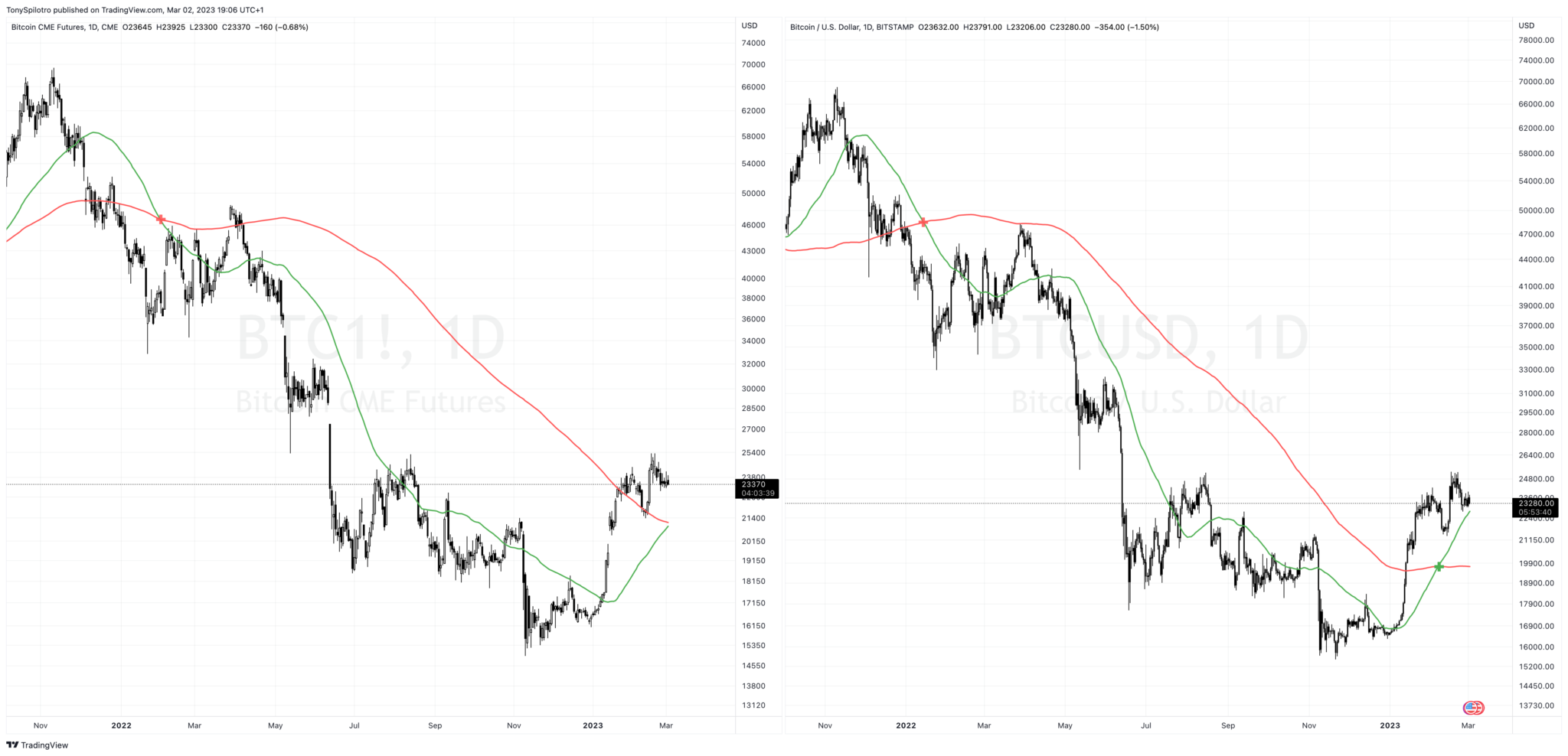 $BTC CME Futures has yet to golden cross on the daily, while #Bitcoin spot exchanges did on February 7.