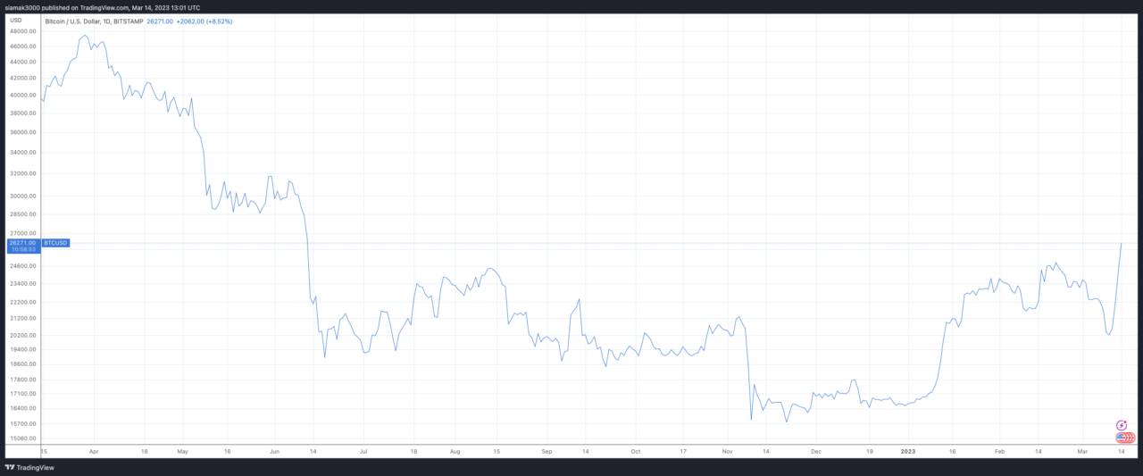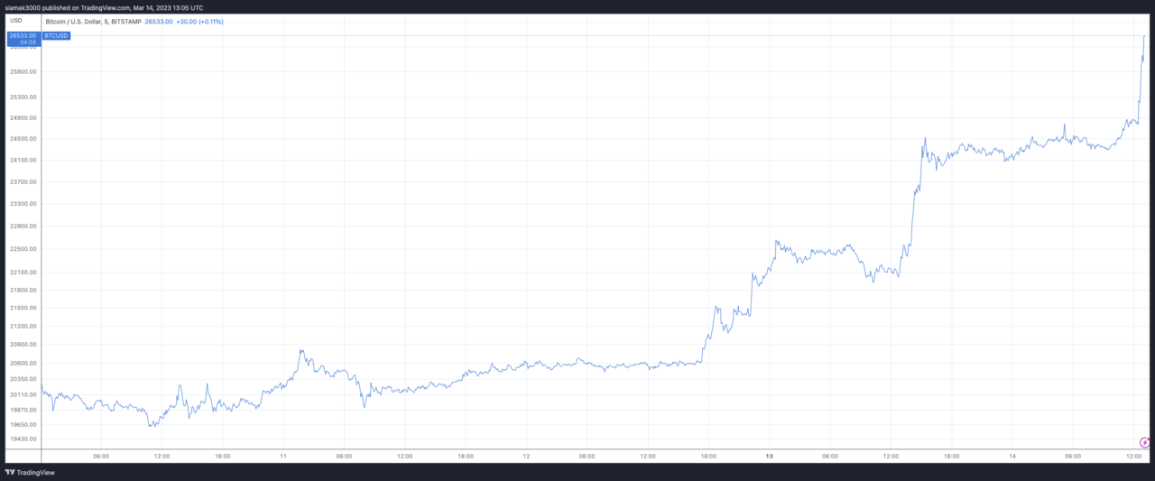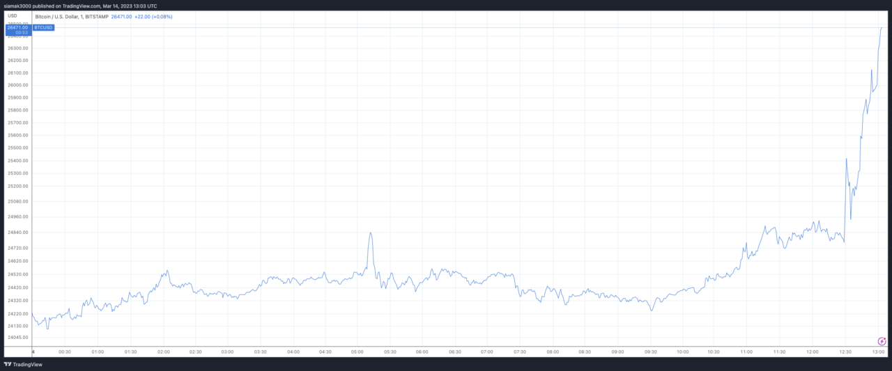 On Tuesday (March 14), the Bitcoin price continued its highly impressive post-SVB-collapse rally, surging above the $26,400 level for the first time since June 12, 2022.