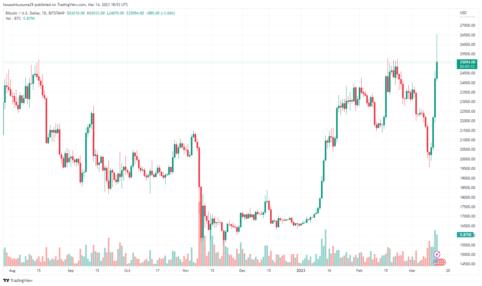Since then, BTC has enjoyed some sharp upwards momentum and has even broken above the $26,000 mark briefly before seeing a pullback to the current $25,000 level.