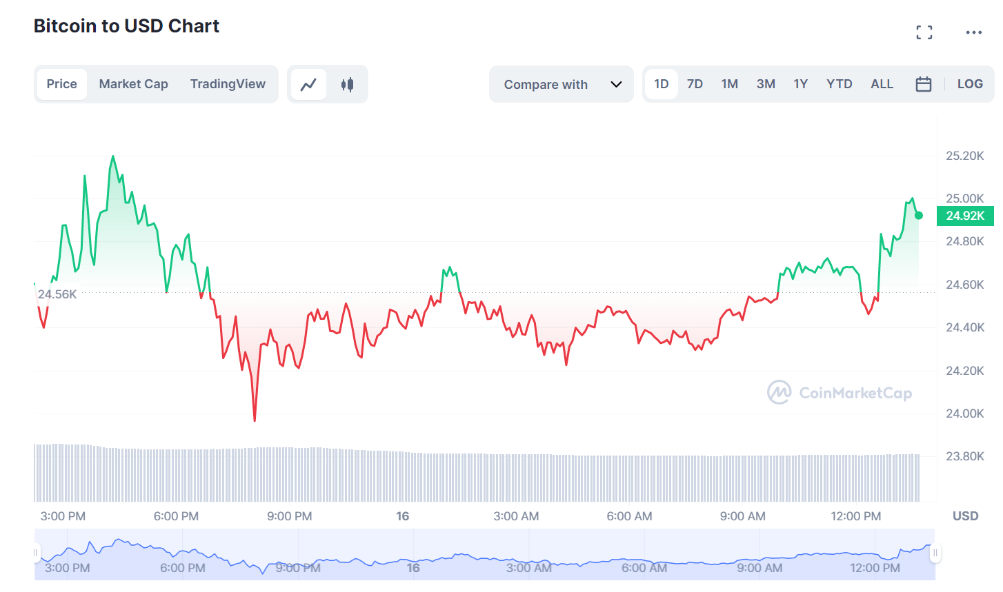 Data from CoinMarketCap showed BTC/USD recovering from a 24-hour drop to reach a high of $25,001 on March 16.