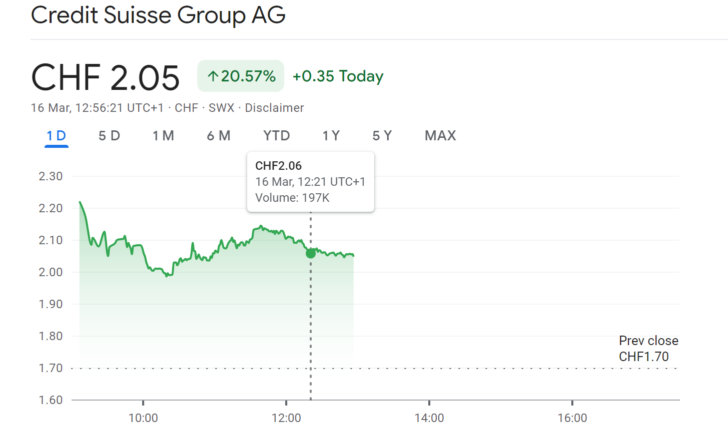 Credit Suisse shares soared over 30% on March 16 after the bank said it would borrow up to $54 billion from the Swiss National Bank.