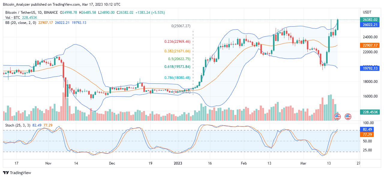 However, the coin has maintained a sharp uptrend in the past week, rising from last week’s depths and soaring above $26,000, printing a new Q1 2023 high.