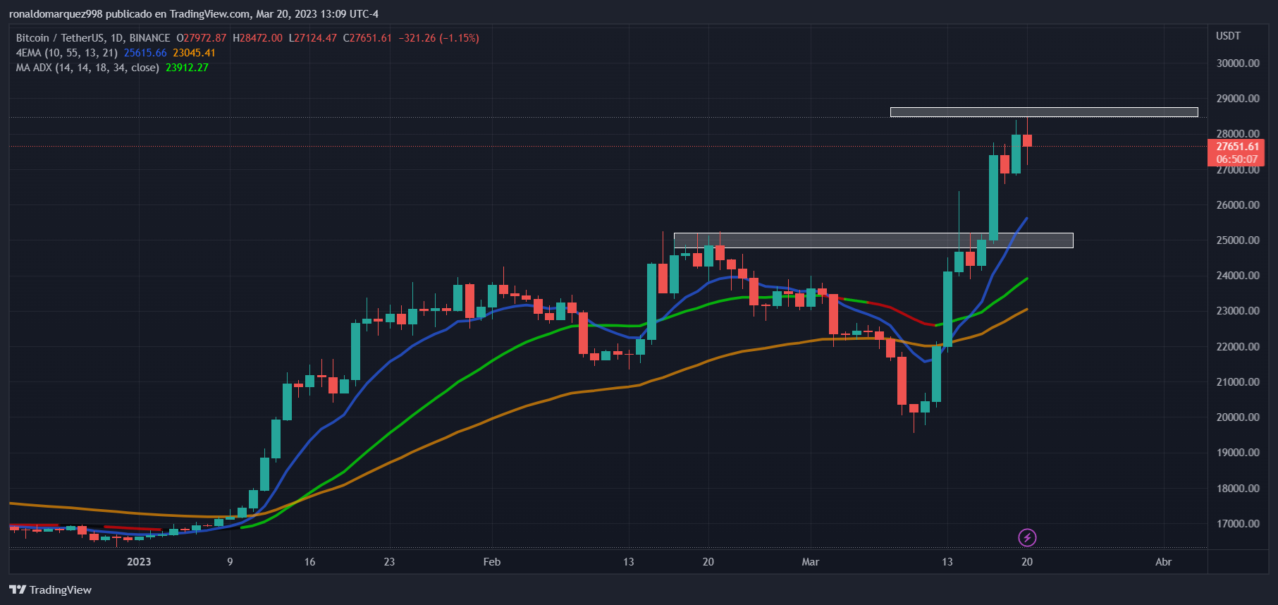 BTC has reported significant gains in wider time frames, with a 26% increase over the last seven days and a 24% increase over the last fourteen days. However, over the past 24 hours, the market’s largest cryptocurrency has seen a 1% decrease following an unsuccessful attempt to break through the $28,600 resistance level.