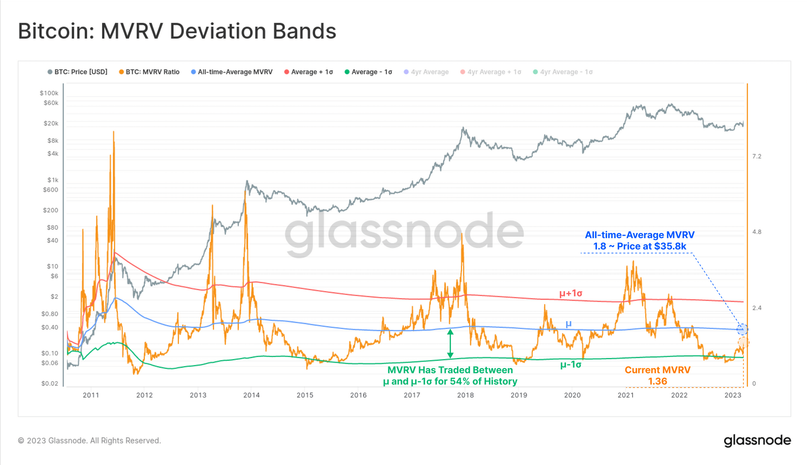 Glassnode’s report also analyzed Bitcoin’s MVRV (market-value-to-realized-value) ratio — which measures the unrealized profit multiple within the coin supply. The ratio has increased to 1.36 after surpassing $27,000 this week and has returned to its “neutral zone.” This suggests that prices are no longer heavily discounted in comparison to the average on-chain market cost basis.