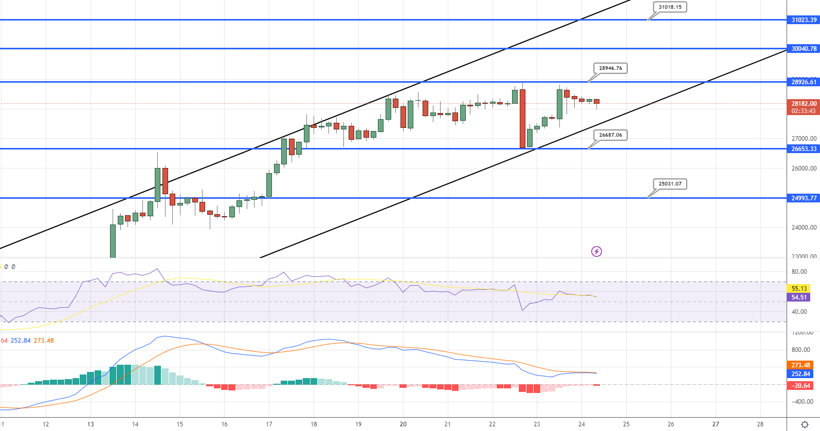 Based on technical analysis, the BTC/USD pair is currently exhibiting a bullish trend, but it could face resistance at the $28,950 level.