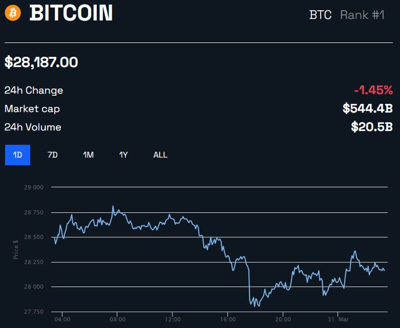 The last open price taken on March 30 was $28,355, marginally higher than Bitcoin’s current price of $28,182.