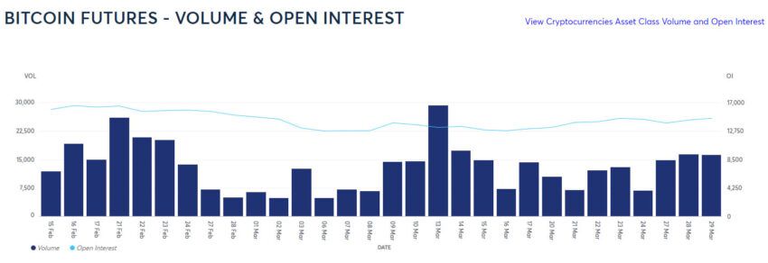 The CME reported a volume of 16,139 contracts as of March 29 and an open interest (OI) of 13,971. OI is a measure of the total number of outstanding futures contracts that have not been settled.
