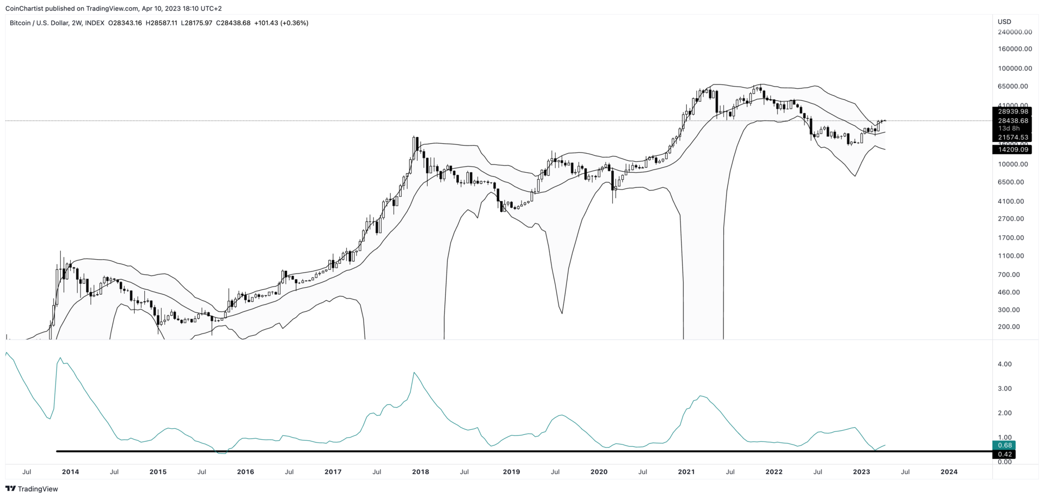 On the 2-week timeframe, BTCUSD Bollinger Bands had reached the second-tightest in history. More importantly, after the bands narrowed, they are now expanding, and Bitcoin is trading above the upper band.