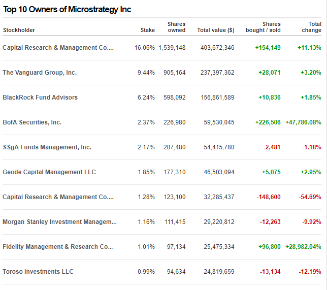 Data from CNN shows that Bank of America is now the fourth-largest shareholder of MicroStrategy after the bank bought tens of millions of dollars worth of MSTR in Q1 of 2023.