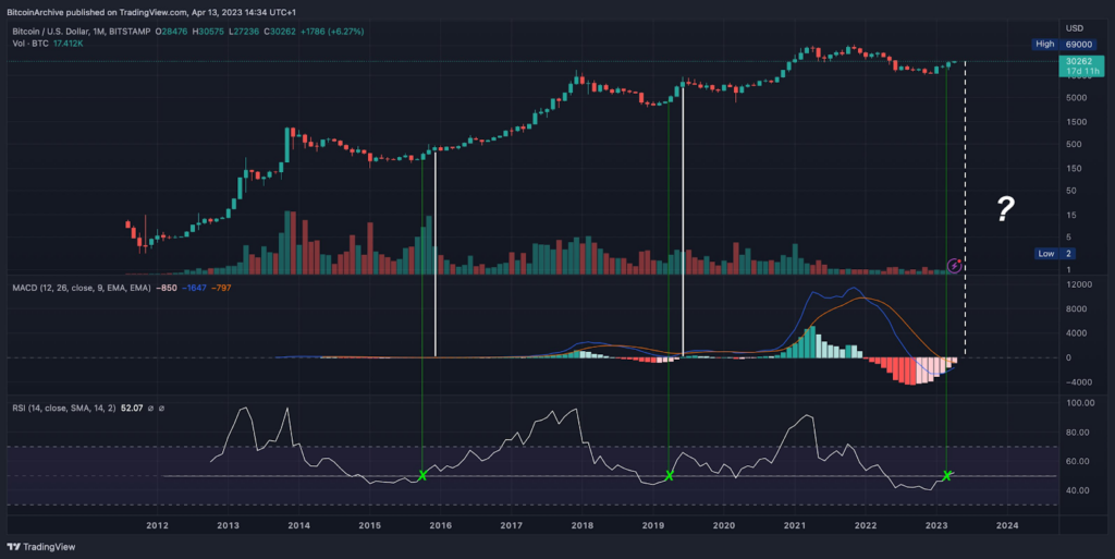 One is @BTC_Archive, a Twitter account that posts bitcoin-related news and charts. On April 13, the analyst suggested that BTC was headed towards a more sustained bull market judging by its historical behavior toward several technical indicators, including the monthly RSI and MACD.