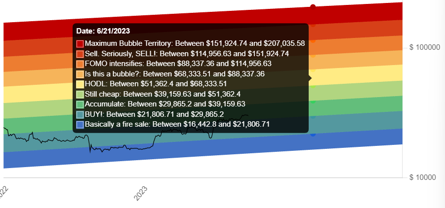 As for the early summer of 2023, the chart projects a range between $151,924.74 and $207,035.58 for Bitcoin, to which it refers as the ‘Maximum Bubble Territory.’ The most bearish scenario expects Bitcoin to trade between $16,443 and $21,807 on June 21, 2023, calling it ‘Basically a fire sale.’