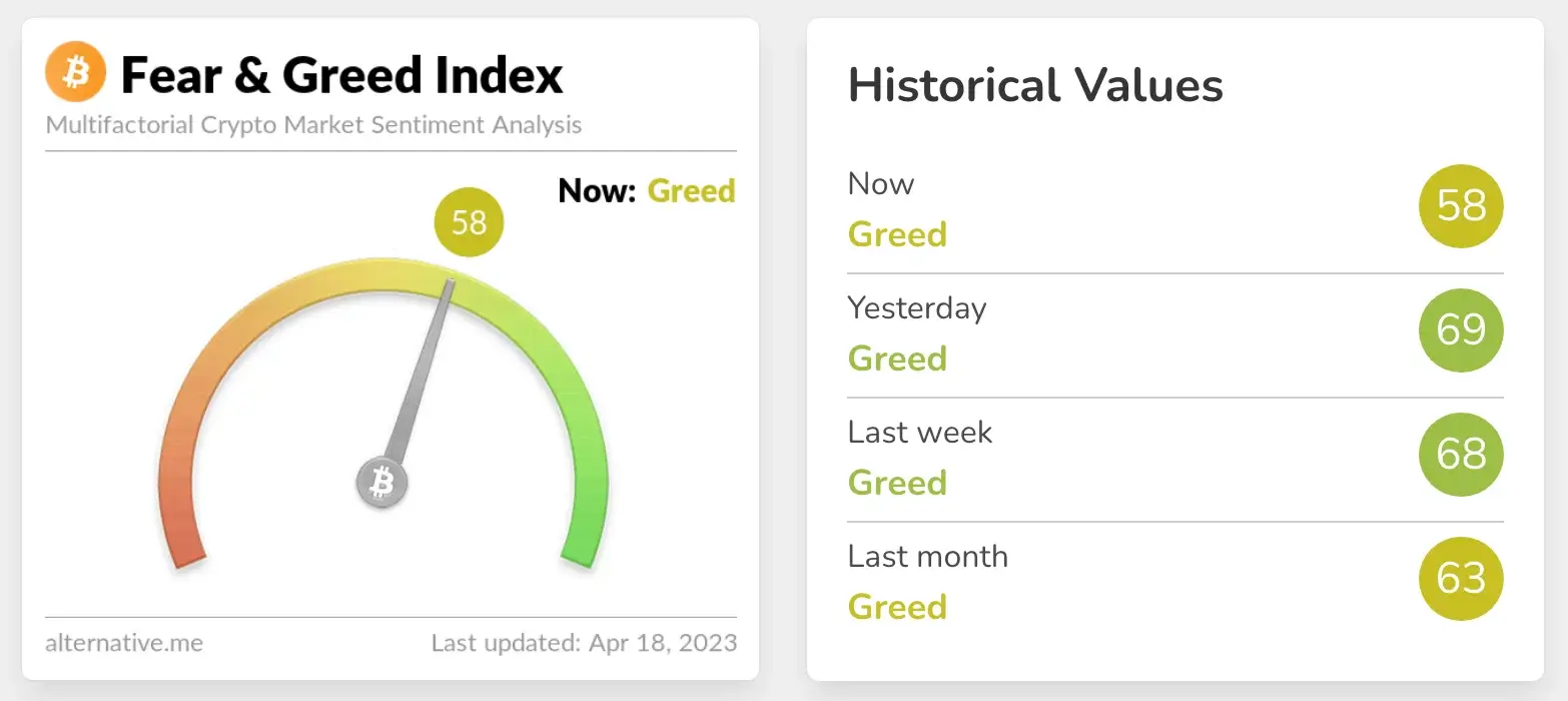 Bitcoin has been trading above $30,000 for a few days, causing the Fear & Greed index to hit its highest level since November 2021. The current index value is 58, indicating a state of “greed.”