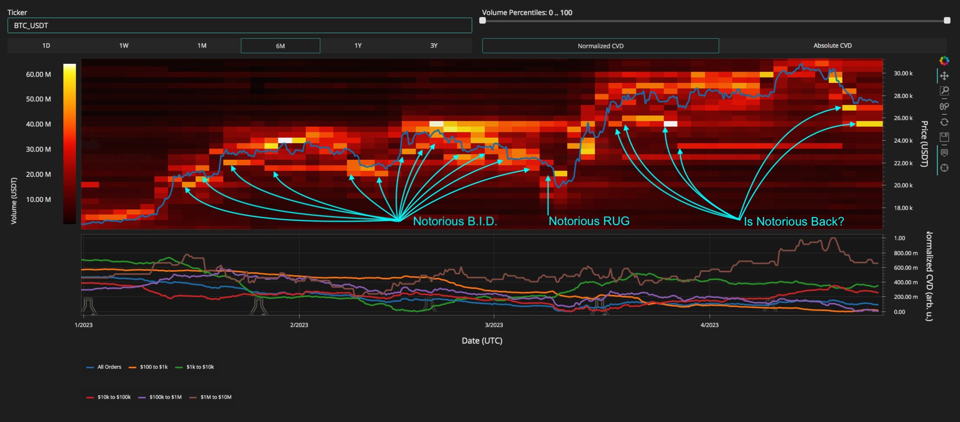 However, Bitcoin is known for its volatility, and bid liquidity movement can provide valuable insights into market activity. In Q1/2023, a block of bid liquidity was identified in what appeared to be controlled by a single entity, which was named Notorious B.I.D, according to the research and analysis firm Material Indicators.