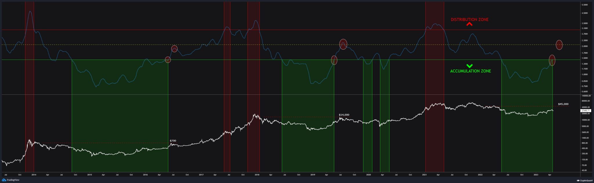 When the MVRV ratio is in the green quadrant, below a value of 1.44, it is considered to be in the accumulation zone. This indicates that there is decreased selling pressure in the market, as the realized capitalization of Bitcoin exceeds its market capitalization. In other words, investors are less motivated to sell their Bitcoin, as they believe that its true value is higher than its current market price.