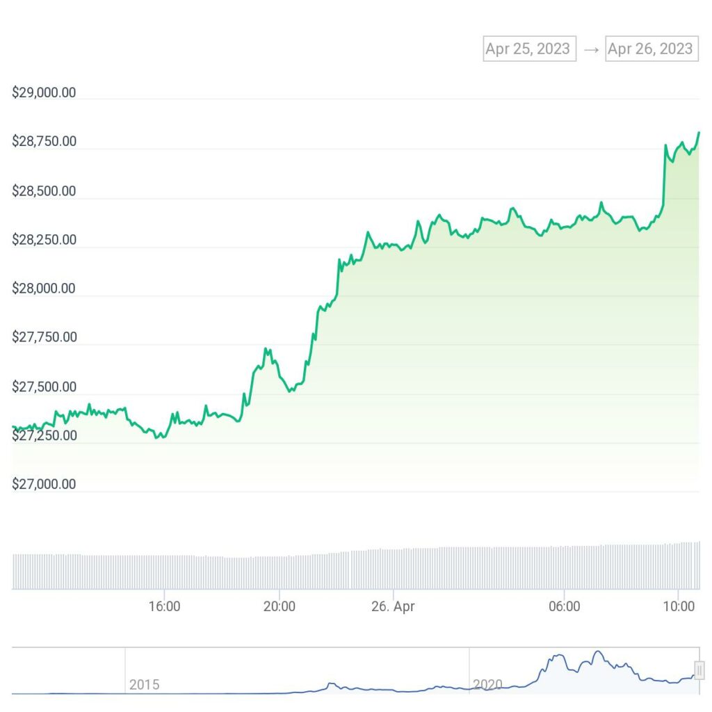 However, at the time of writing, the price of BTC has regained its bullish momentum, rising to as high as $28,780 in the last 24 hours.