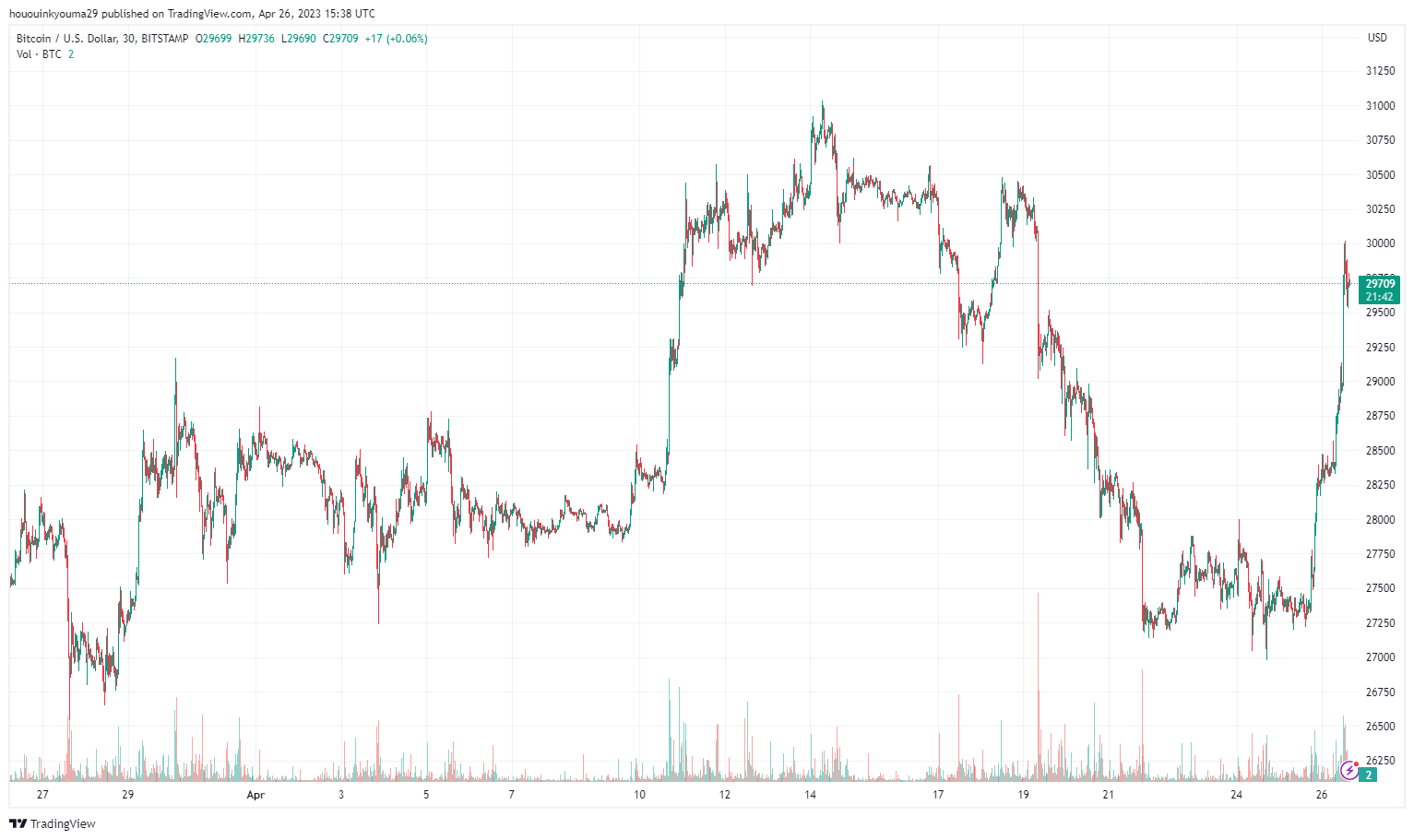 At the time of writing, Bitcoin is trading around $29,700, up 1% in the last week.