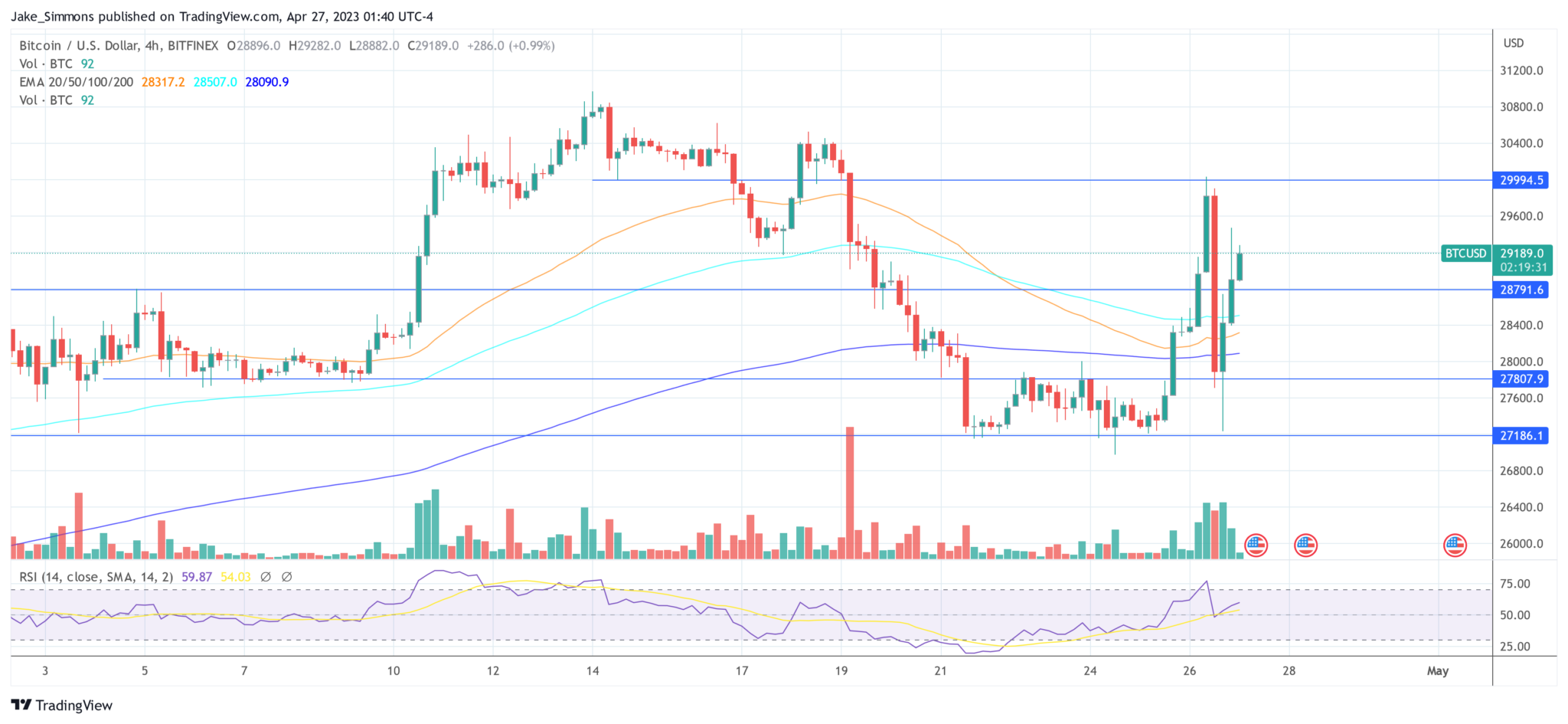 At press time, the Bitcoin price has already recovered from the sharp drop. BTC already erased most of the losses and was trading at $29,189.
