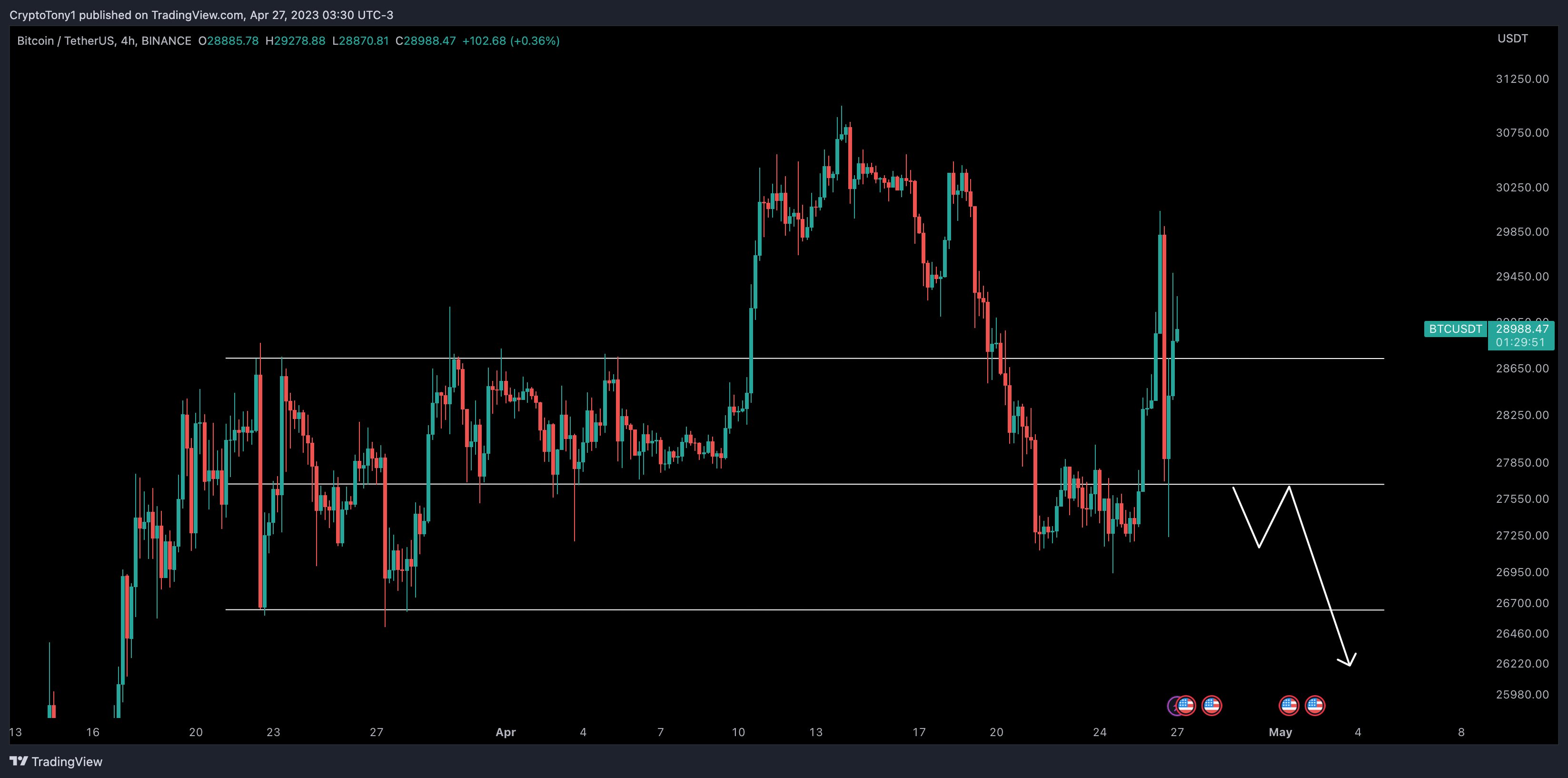 Trader Muro focused on $29,500 as the make-or-break zone for Bitcoin, with acceptance or rejection at that level key to determining trend direction.