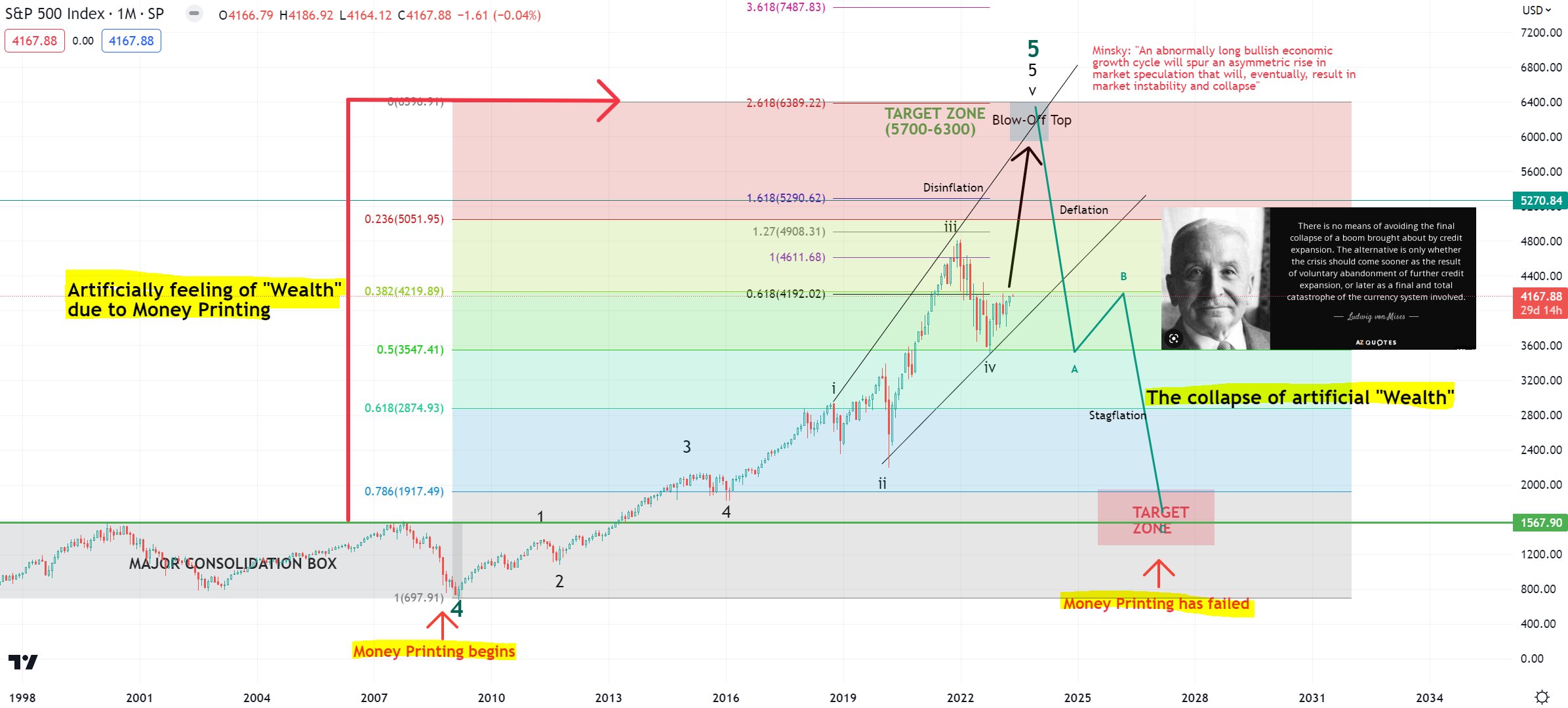 He uses the Fibonacci Ratio within an Elliott Wave structure to predict the S&P 500 will skyrocket beyond 5,700 points before imploding down to 1,567 points.