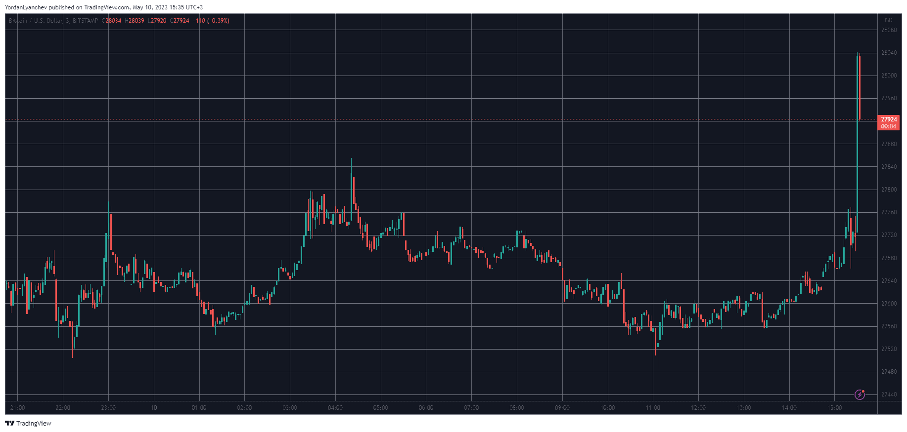 - Bitcoin reacted with an immediate price surge from $27,500 to chart a multi-day high at over $28,000.