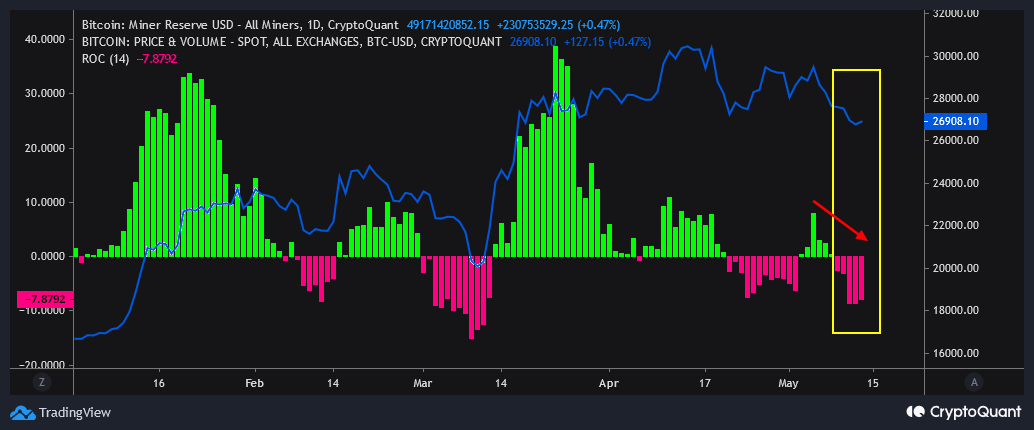 The chart shows that miners were heavily accumulating Bitcoin from mid-March until mid-April, after which a wave of sell pressure helped push the asset down from over $30,000 to below $27,300 within three days.