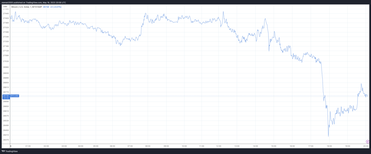 According to data from TradingView, BTC is currently (as of 8:06 p.m. UTC on May 18, 2023) trading at around $26,738, down 2.12% in the past 24-hour period.