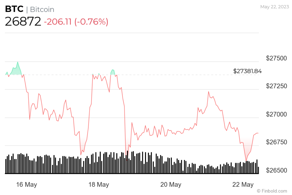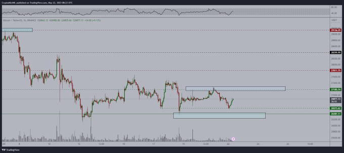 In looking at Bitcoin’s possible price pump, the focus is on reclaiming the $27,000 support level. In this line, cryptocurrency trading analyst Michaël van de Poppe, in a tweet on May 22, acknowledged that Bitcoin remains flat, and if the crypto breaks the $27,200 level, it’s likely to rally to $29,000 and potentially record new highs.